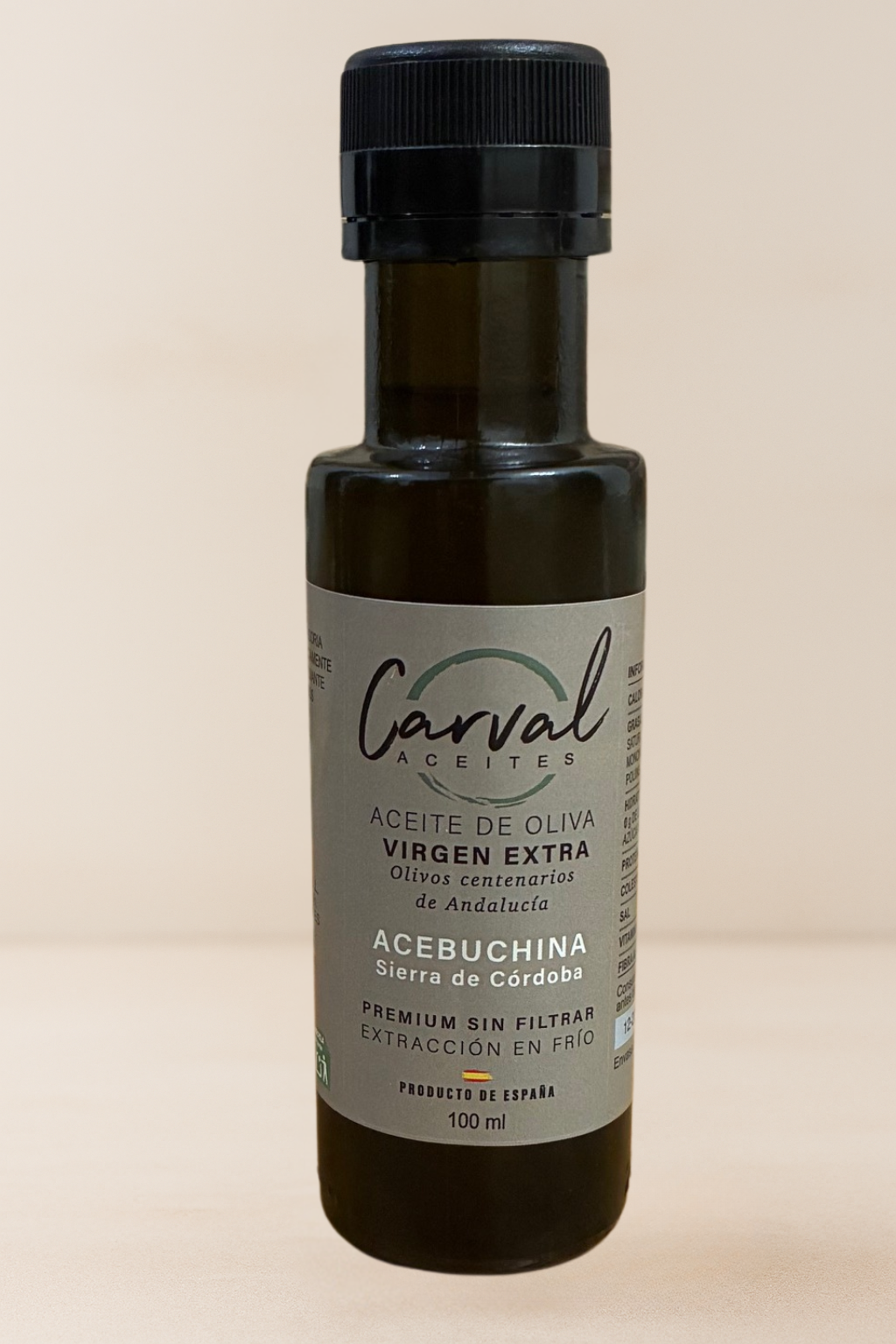 Aceite de acebuchina, recolectado a mano de acebuches silvestres de la Sierra de Córdoba.  El aceite de acebuchina es aromático y suave, no pica ni amarga nada pero tiene sabores complejos para saborearlo siempre en crudo y sin mezclar con nada. Es un producto muy especial, para paladares que buscan armonía y suavidad en un aceite hecho directamente por la naturaleza sin intervención del cultivo humano. Por supuesto, en esos campos no se añade nada relacionado con tratamientos agrícolas y el abono que pueden recibir procede únicamente de la materia vegetal y de los animales que hay en la zona.